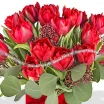 35 тюльпанов: тюльпаны красные - 35 шт., эвкалипт - 8 шт., бант красный.