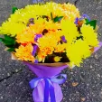 Стандартный: хризантема кустовая жёлтая - 4 шт., хризантема кустовая оранжевая - 3 шт., статица - 3 шт., салал, крафт.