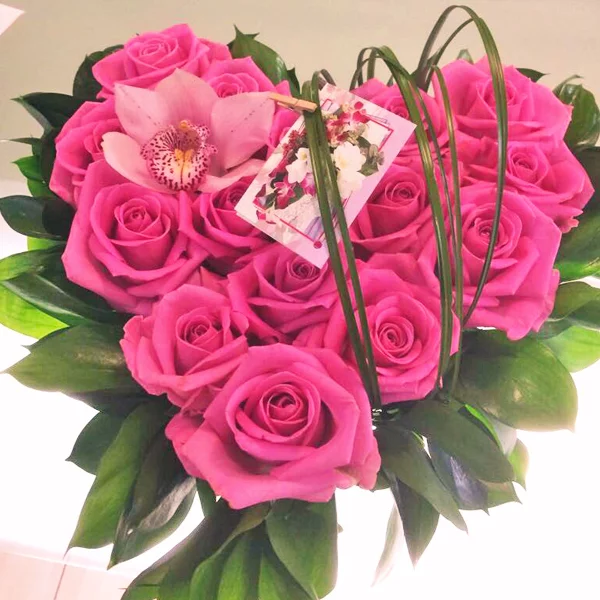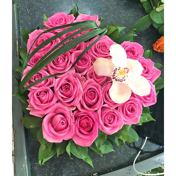 Люкс: роза розовая - 22 шт., орхидея белая - 1 шт., декоративная зелень., декор., оазис.