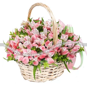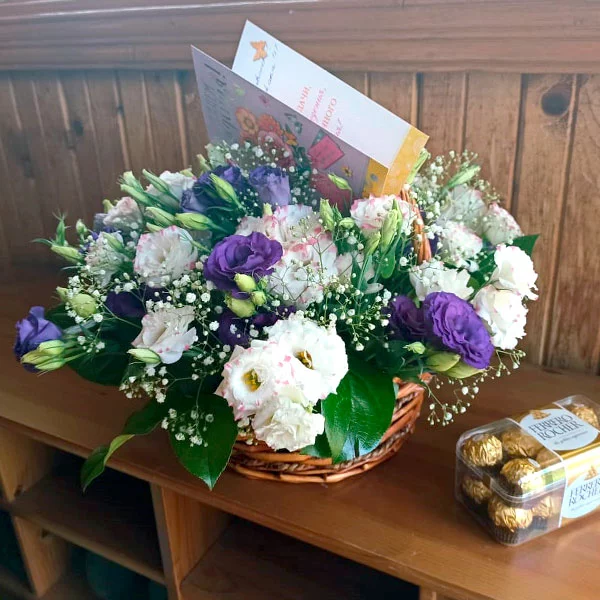 Нежное сочетание белых и сиреневых эустом выигрышно подчеркивает гипсофила и декоративная зелень. Букет, помещенный в изящную корзину, станет безупречным решением для вручения дорогому человеку на праздник.